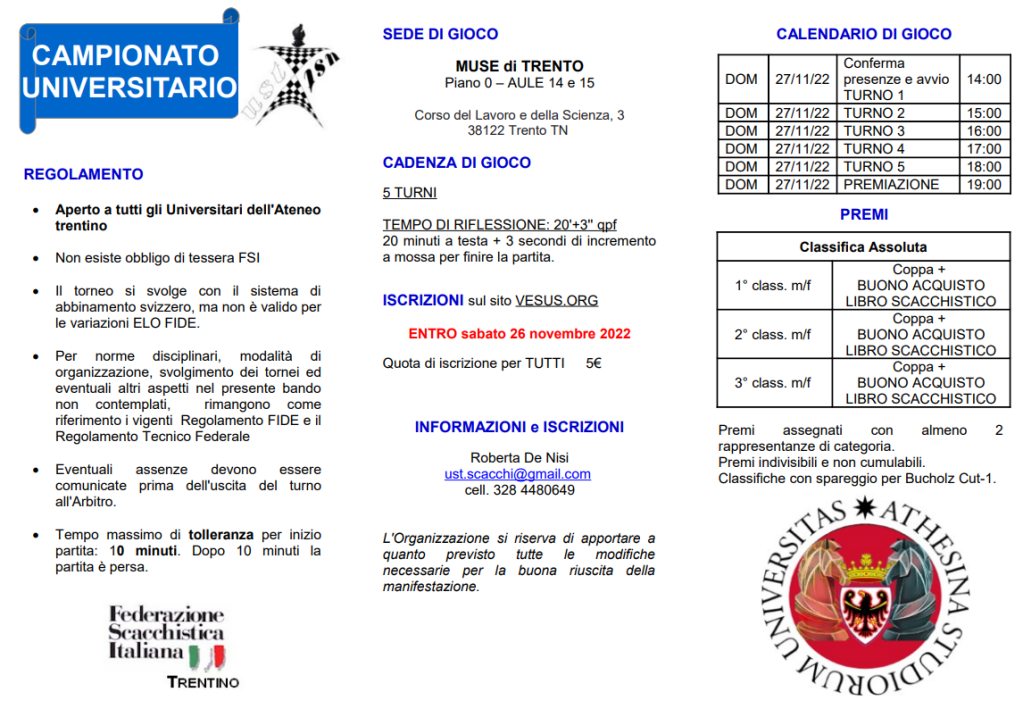 CAMPIONATO UNIVERSITARIO TRENTINO Posted on 22 novembre 2022 by Robbi DOMENICA 27 NOVEMBRE 2022 ISCRIZIONI SU https://vesus.org/tournaments/campionato-universitario-trentino/ Condividi: Fai clic per condividere su X (Si apre in una nuova finestra) X Fai clic per condividere su Facebook (Si apre in una nuova finestra) Facebook Mi piace Caricamento...