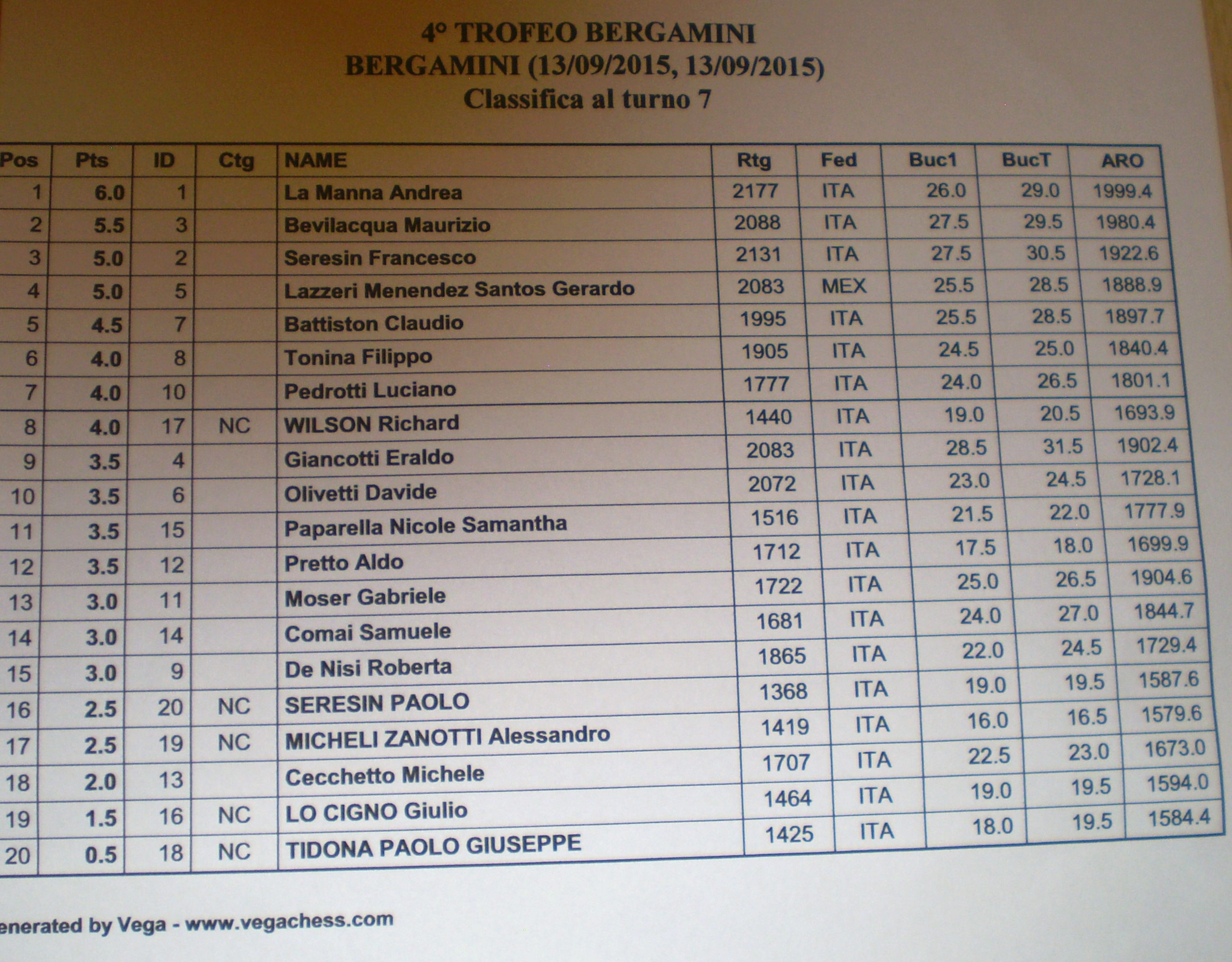 Nei sette battagliati turni ha alfine prevalso il Maestro di casa, e favorito nel ranking iniziale, Andrea La Manna, solitario in vetta con 6 punti. Maurizio Bevilacqua ha bissato la convincente prestazione dell’anno scorso giungendo nuovamente secondo, ancora con 5,5 punti. Con 5 punti invece Francesco Seresin, il cui talento è pari solo alla sua generosità, ha agguantato il terzo posto a scapito di Lazzeri Menendez, penalizzato da un primo spareggio peggiore. Ultimo dei premiati – e ci mancherebbe altro – Claudio , 4,5 punti in totale. A Nicole Samantha Paparella (3,5 punti) e Gabriele Moser (3) i rispettivi premi per la categoria Under 16.